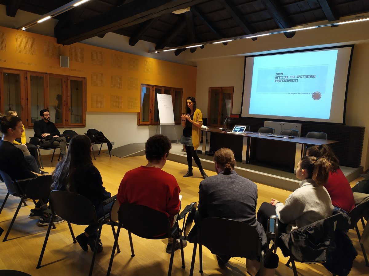 I ragazzi di ZOOM incontrano Silvia Ferrari. Giornalista e critica, ma soprattutto organizzatrice teatrale, Silvia presenta ai ragazzi tutte le maestranze che fanno parte della macchina del teatro (attori, registi, scenografi, costumisti, macchinisti, fonici, illuminotecnici, direttori di scena, organizzatori, responsabili della comunicazione …ecc…) per poi fare un focus sull’unica figura senza la quale il teatro non può esistere: lo spettatore.